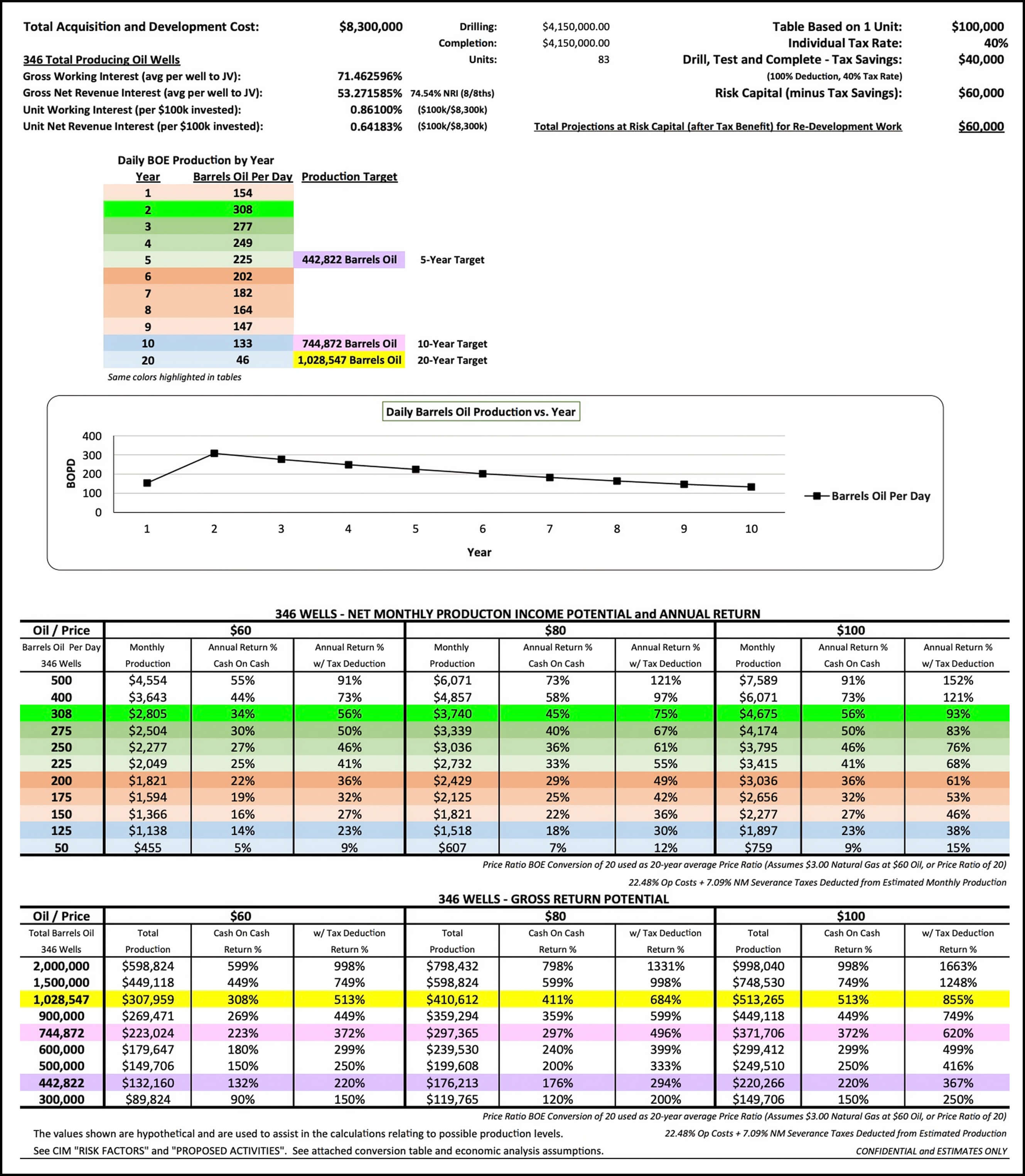 Historical oil and gas production from the 100 leases totals 22.4 million barrels of oil and 51 billion cubic feet of gas (or 25 million barrels oil equivalent). Current gross oil production is 154 barrels of oil per day (or 81 barrels oil per day net to the JV interests), with immediate plans to implement 140 workovers – 120 oil wells and 20 injections wells. Phase 1 expected incremental oil production is 154 barrels oil per day which would equal a 100% increase in production in the next 18 months, establishing a new gross production rate of 304 barrels oil per day (or 162 barrels oil per day net to the JV interests), with a 10-year target production estimate of 744,872 barrels of oil (post workovers and re-completions), which equate to a 3% incremental over historical field production of 25 million barrels oil equivalent.